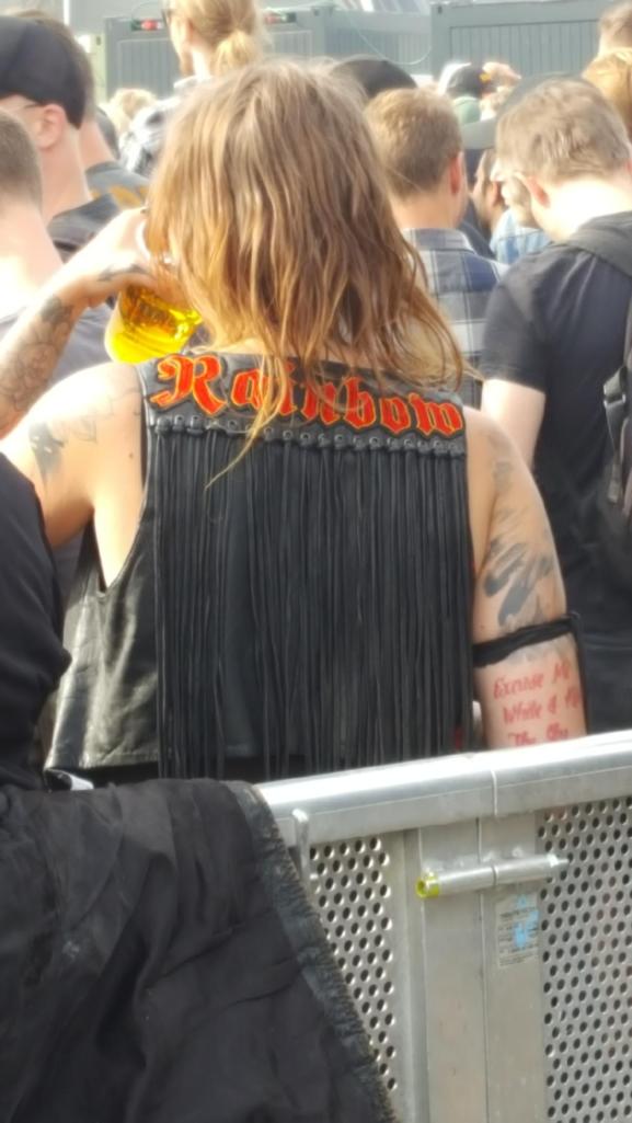 <– 18.00, Fez: Bedste outfit ever. Rainbow-vest med frynser over ærmeløs Judas Priest-trøje.