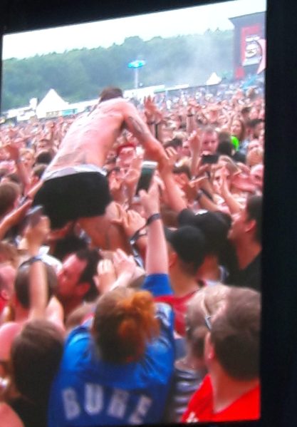 17.53, Fez: Circle pit HELE vejen rundt om lydtårnet og ølboden. En del falder, optræk til kaos. Går vist okay. Bagefter vil Frank have folk til at crowdsurfe. Men kun kvinder. Og er der fyre, der rør udsatte steder, lover han at skære deres hoveder af og stege dem på grillen!