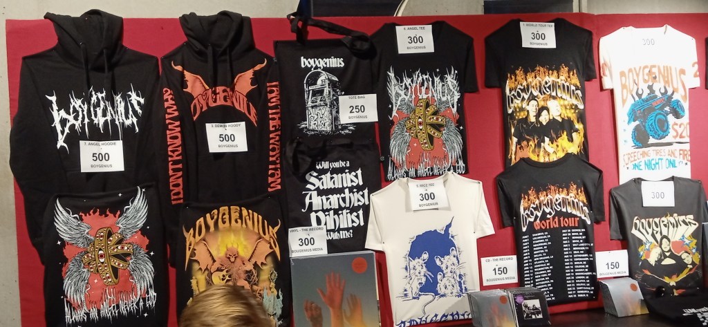 KONCERT Boygenius var gode i KB-Hallen i går. De er dygtige, ved hvad de laver og var desuden et charmerende bekendtskab. Ikke alt var lige godt, f.eks. indimellem når de rockede hårdest, men det var nærværende, sjovt og rørende. Phoebe Bridgers har gennemslagskraft, Julien Baker (i Angus Young-agtigt skoleuniformslook med lange knæstrømper – og sorry, jeg har ikke overholdt mine SoMe-forpligtigelser, for jeg glemte at tage billeder under koncerten) – er dejligt skæv, og min respekt for sidste medlem af trioen, Lucy Dacus, voksede. Hun og hendes sange kunne mærkes stærkere live end på plade/stream. Og hendes grineflip midt i ’Leonard Cohen’ over et skilt i publikum med påskriften ”That’s kinda gay” var naturligvis sjovt. Publikum var også godt, men bedst af alt var måske alligevel deres merchandise. Boygenius er simpelthen så rå (og macho), at der er monstertrucks, og stilen er heavy metal, endda med skrifttype, som man finder i ekstrem-metallen. Sjovt. (Og dyrt.)